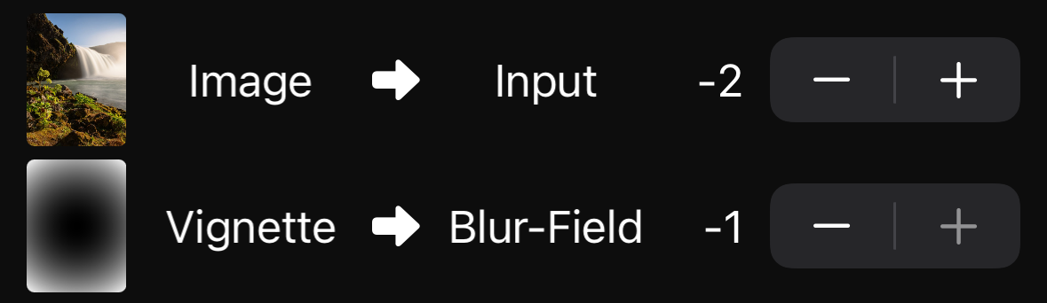 The connections between filters can be configured by setting relative distances. For example, -1 means, the preceding filter's output is used. -2 means, the filter at one position earlier is used, and so forth. The earliest position possible is called "root", which respresents the camera input for a top-level chain or the input of a nested chain.