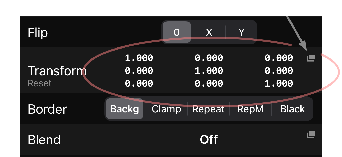 All parameters with this symbol can be tapped to access additional functionality in a modal full-screen view like manipulating transformations, drawing polygons, etc.